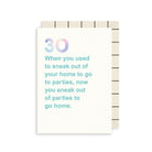 Celebrate this occasion with a funny 30th birthday card. This white card is paired with blue typography and it reads '30, when you used to sneak out of your home to go to parties, now you sneak out of parties to go home'.