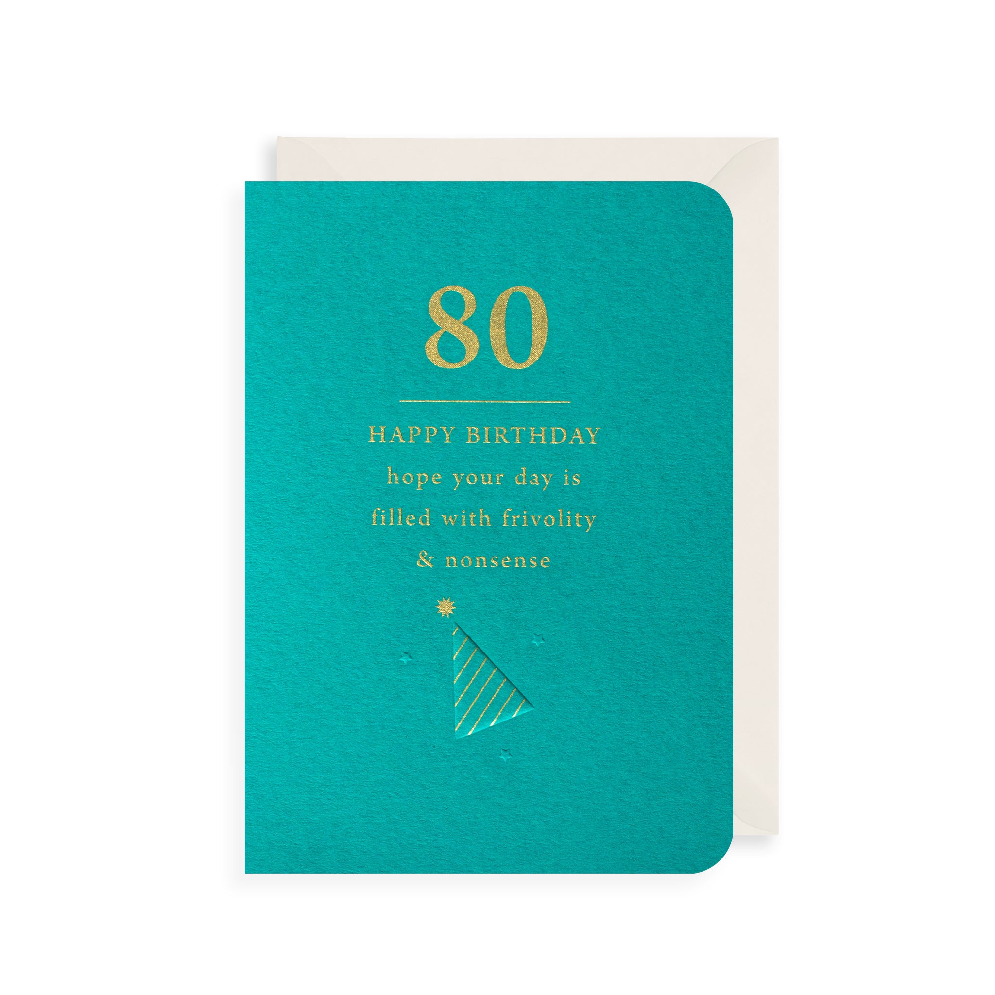 Celebrate a 80th birthday with this luxury card. This card features an illustration of a gold birthday hat paired with gold typography. The card reads '80, Happy Birthday. Hope your day is filled with frivolity & nonsense'.