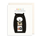 Say happy birthday with this fun and thoughtful card. This card features a bear holding a camera that's printing a polaroid photo. The card says 'Smile! It's your birthday.'