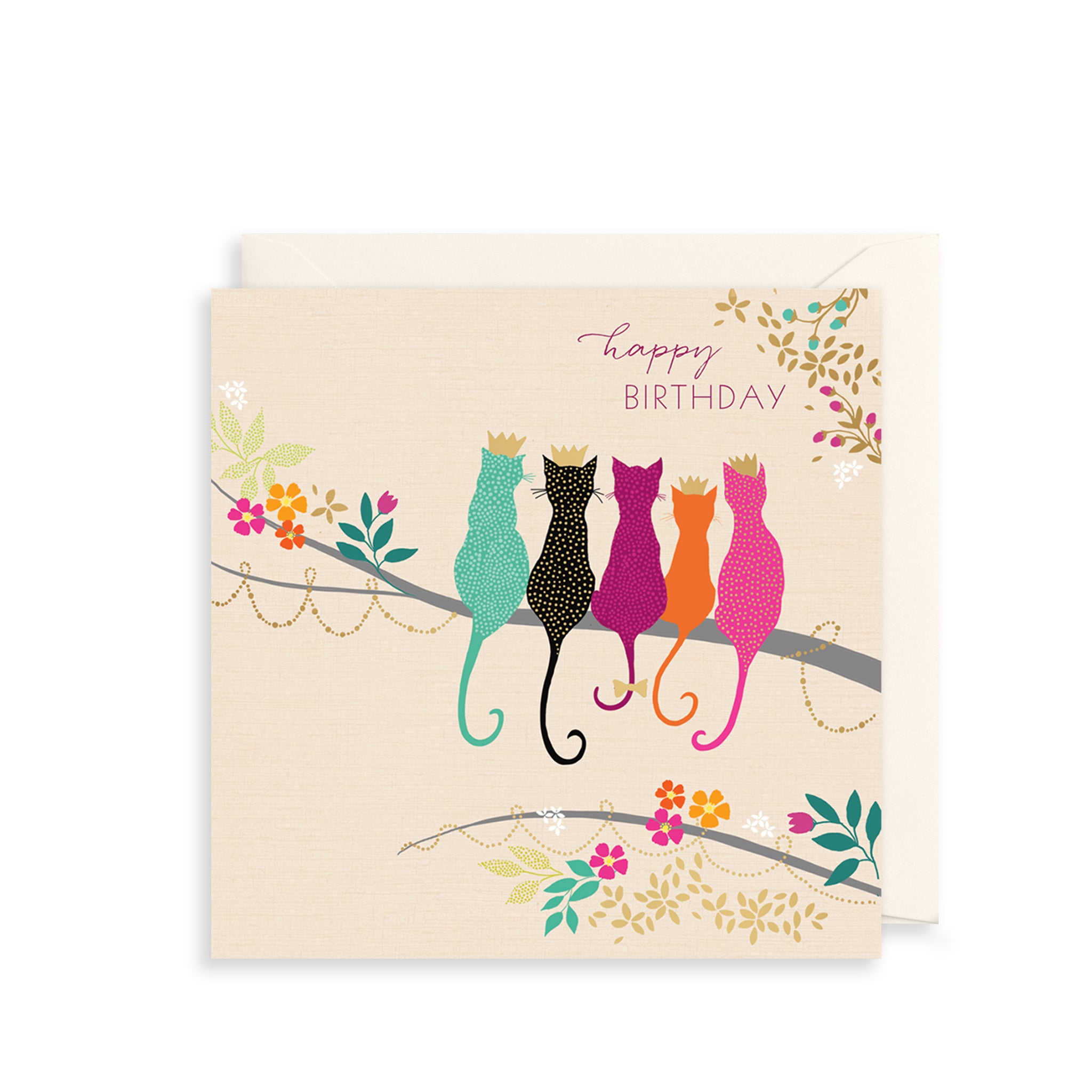 Say happy birthday with this lovely greetings card. This birthday card features five cats perched together on the branch of a tree. The card reads 'Happy birthday'.
