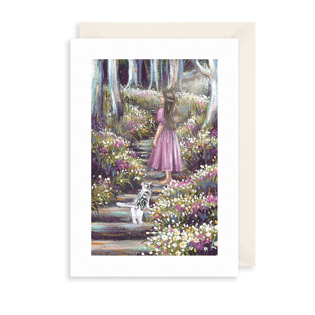 Make someone's smile with this stunning art card. This card features a girl and her cat walking through a botanical forest filled with pastel flowers.