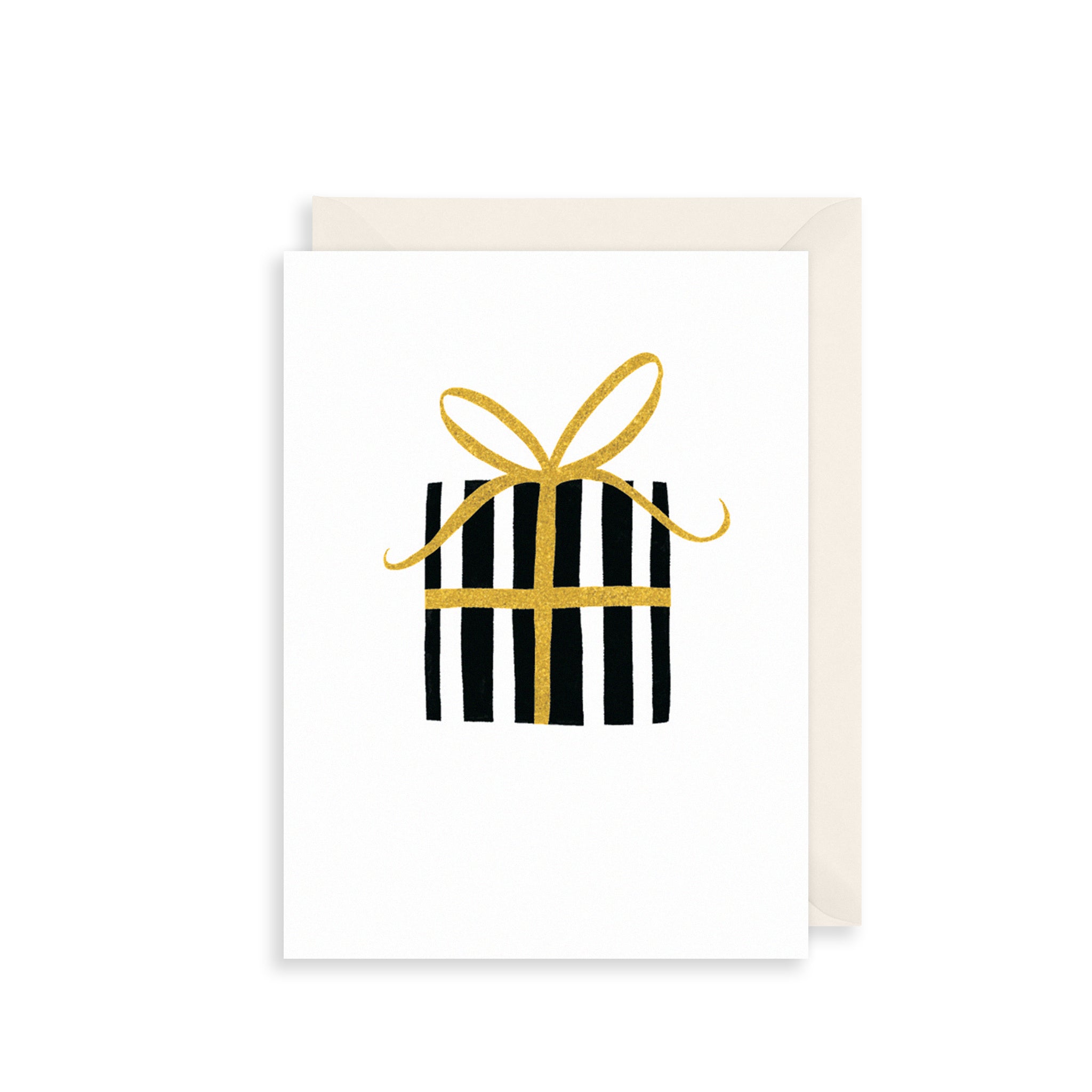 Put a smile on someone's face with this thoughtful card. This card features a gold and black striped present, paired with a white background.
