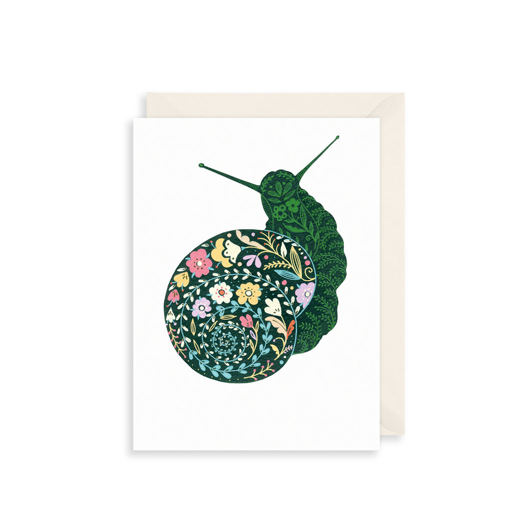 Make someone smile with this detailed art card. This card features a patterned illustration of a snail, featuring flowers, botanicals and green leaves.