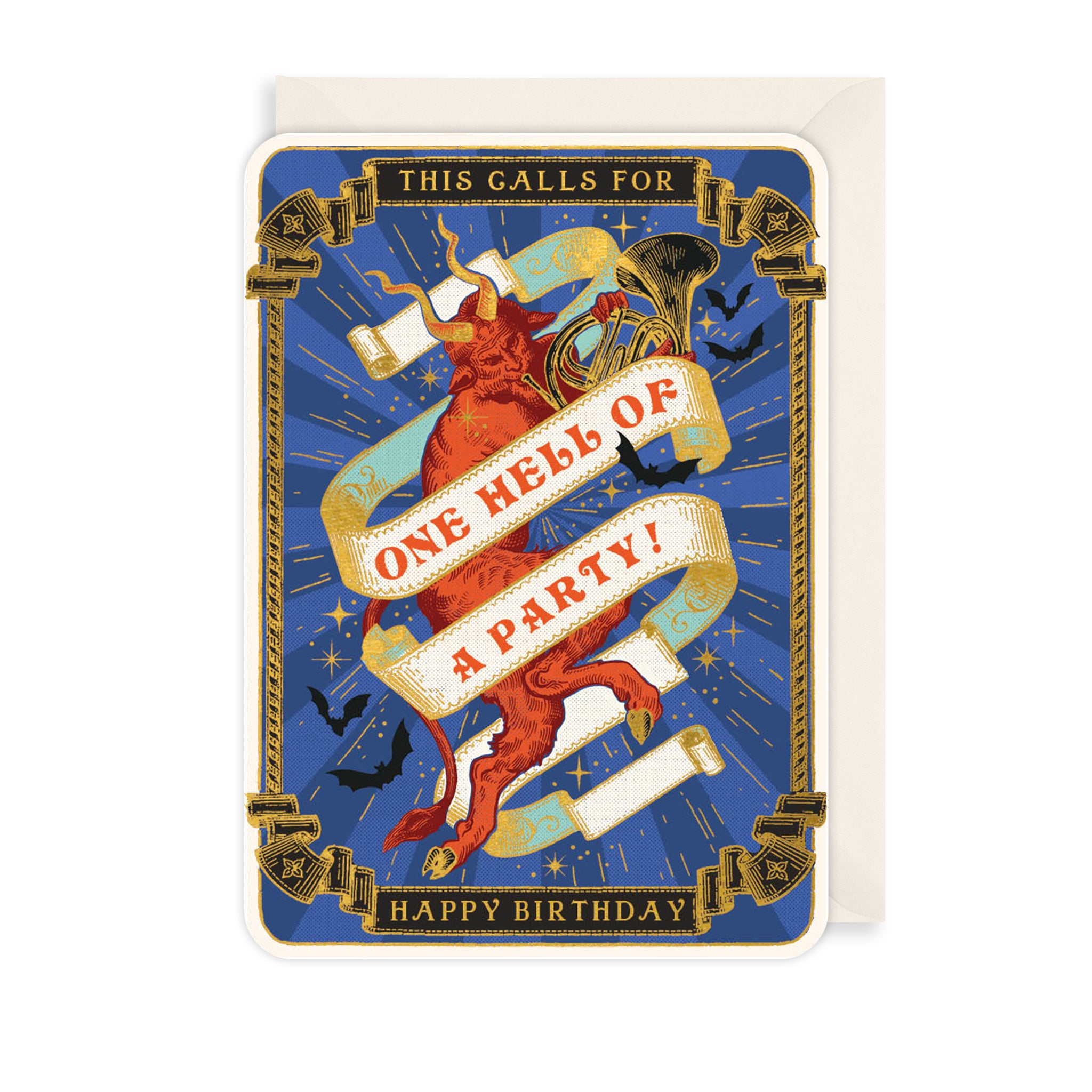 Make them laugh on their birthday with this witty medieval period inspired card. Featuring an intricate illustration of a devil playing the french horn, this humorous greetings card reads "This calls for one hell of a party! Happy Birthday".