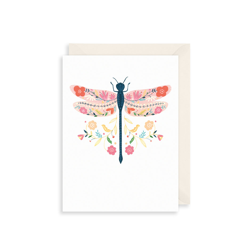 Make someone smile with this gorgeous nature card. This card features a detailed and patterned illustration of a pink dragonfly surrounded by botanicals.