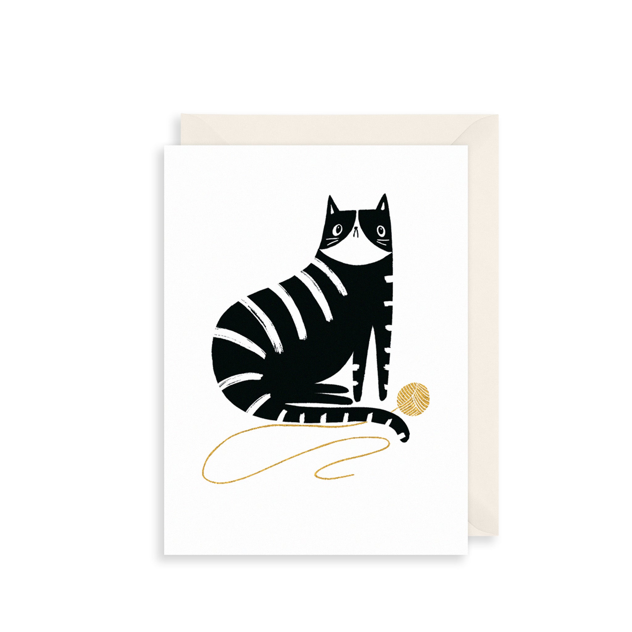 Make someone smile with this adorable card. This card features a stripy black and white cat playing with a golden ball of string.