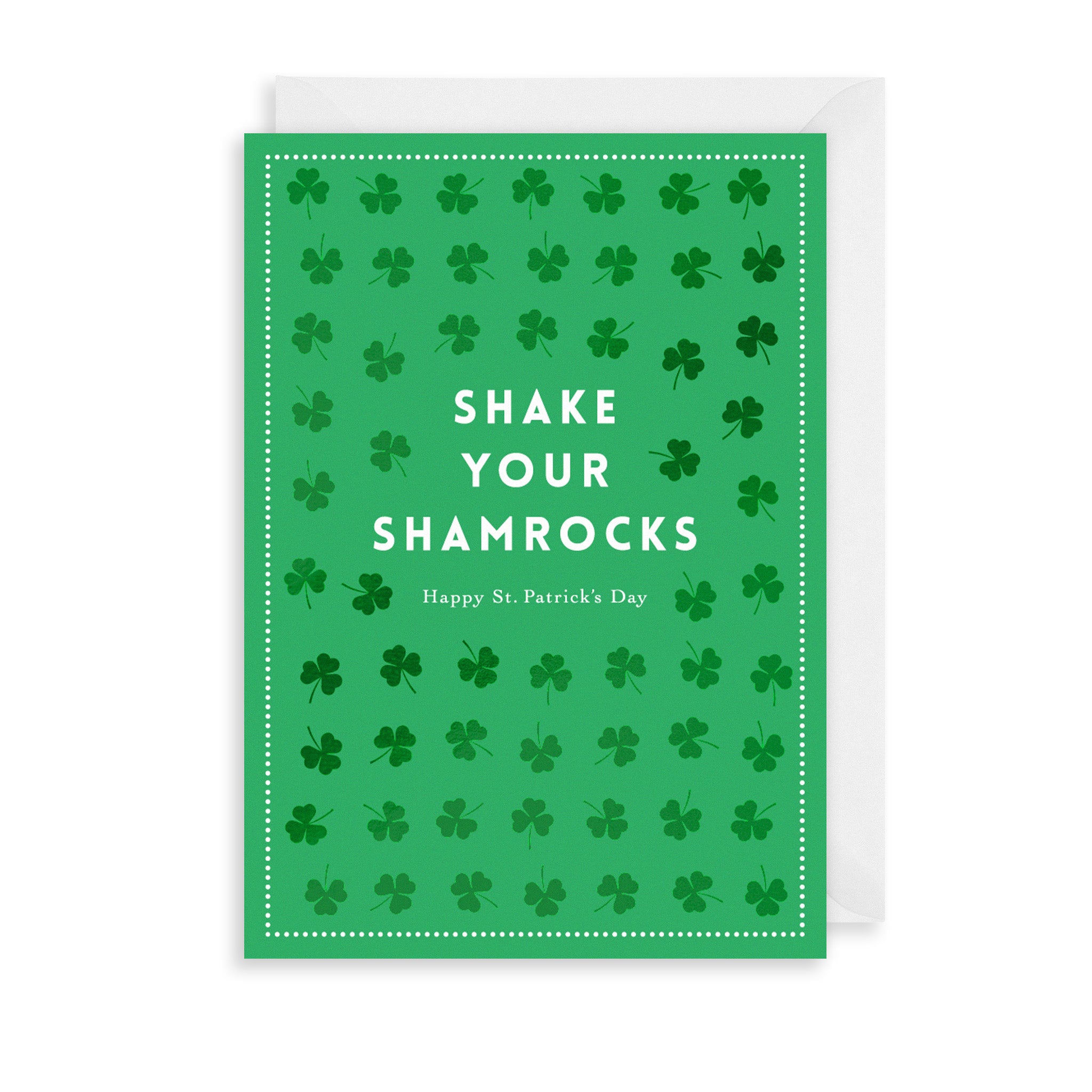 Celebrate St.Patrick's Day with this playful card. This card features a pattern of shamrocks and reads 'Shake your shamrocks. Happy St.Patrick's Day'.