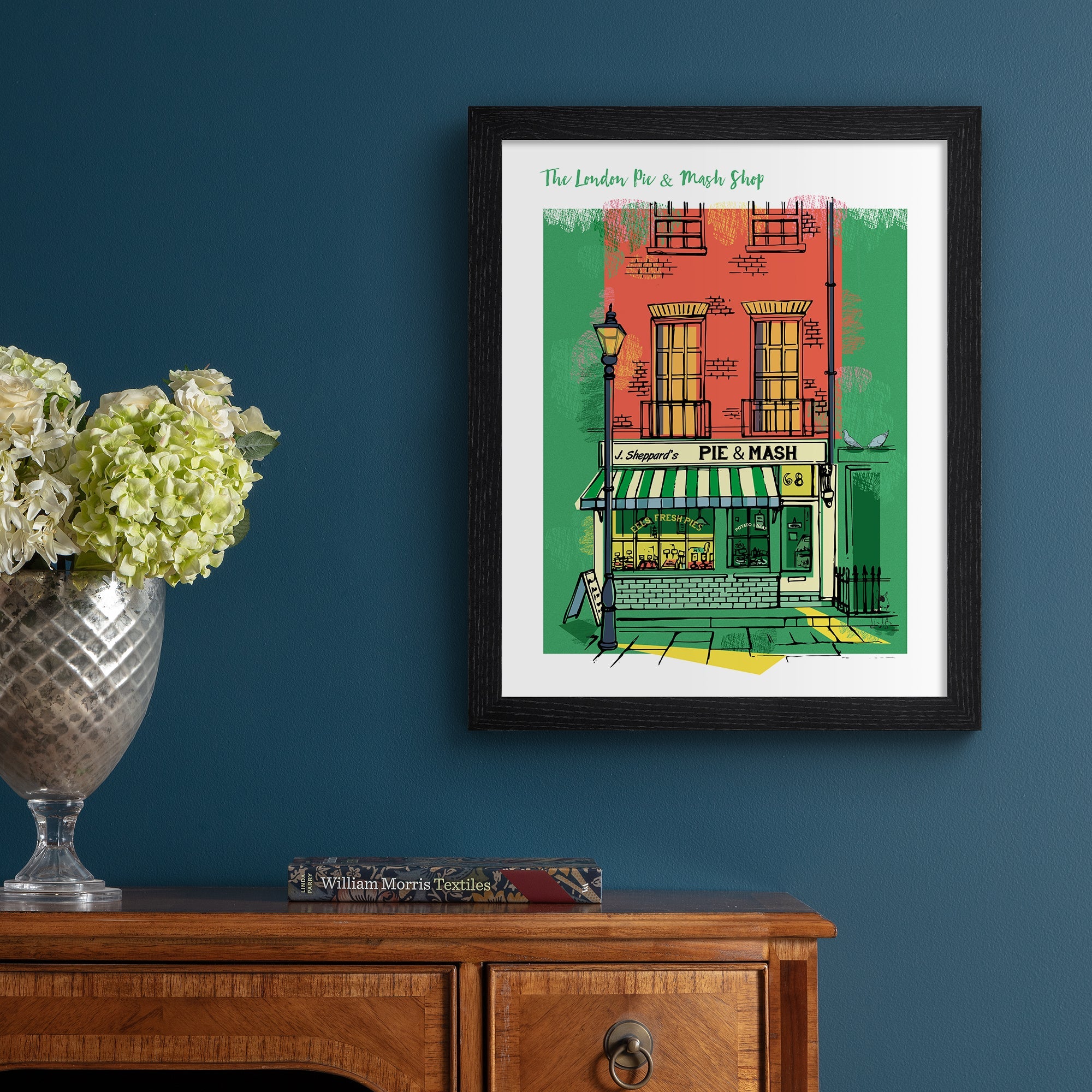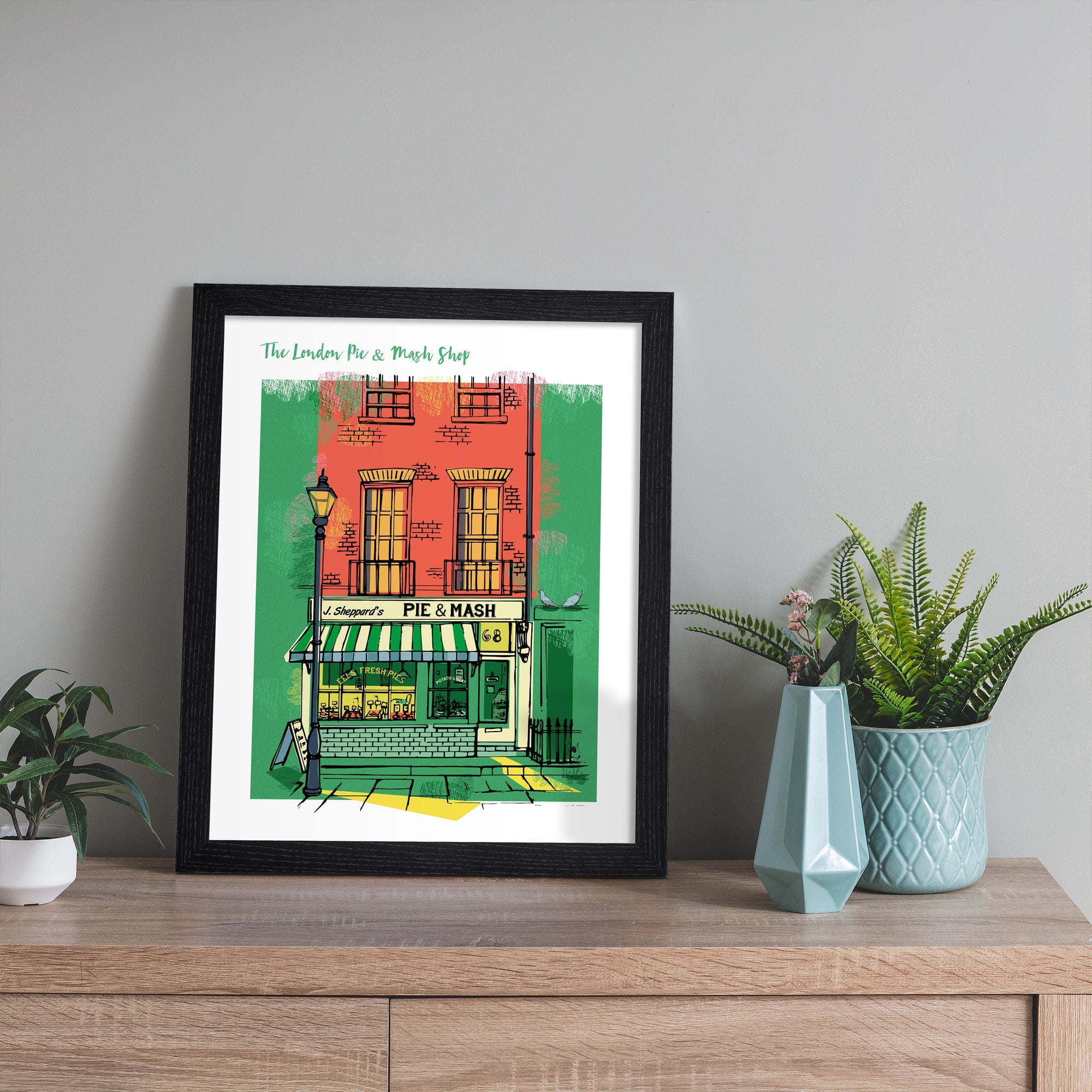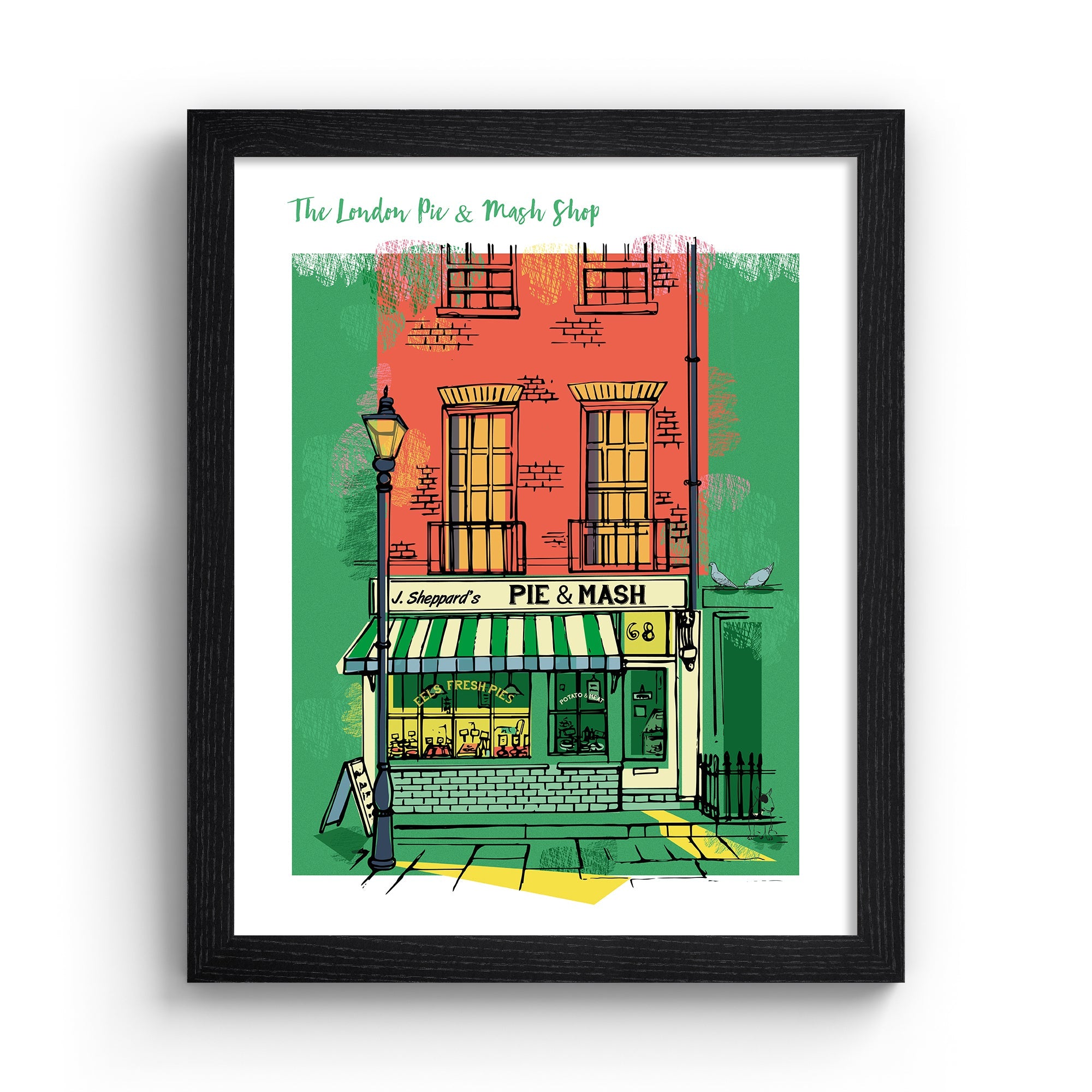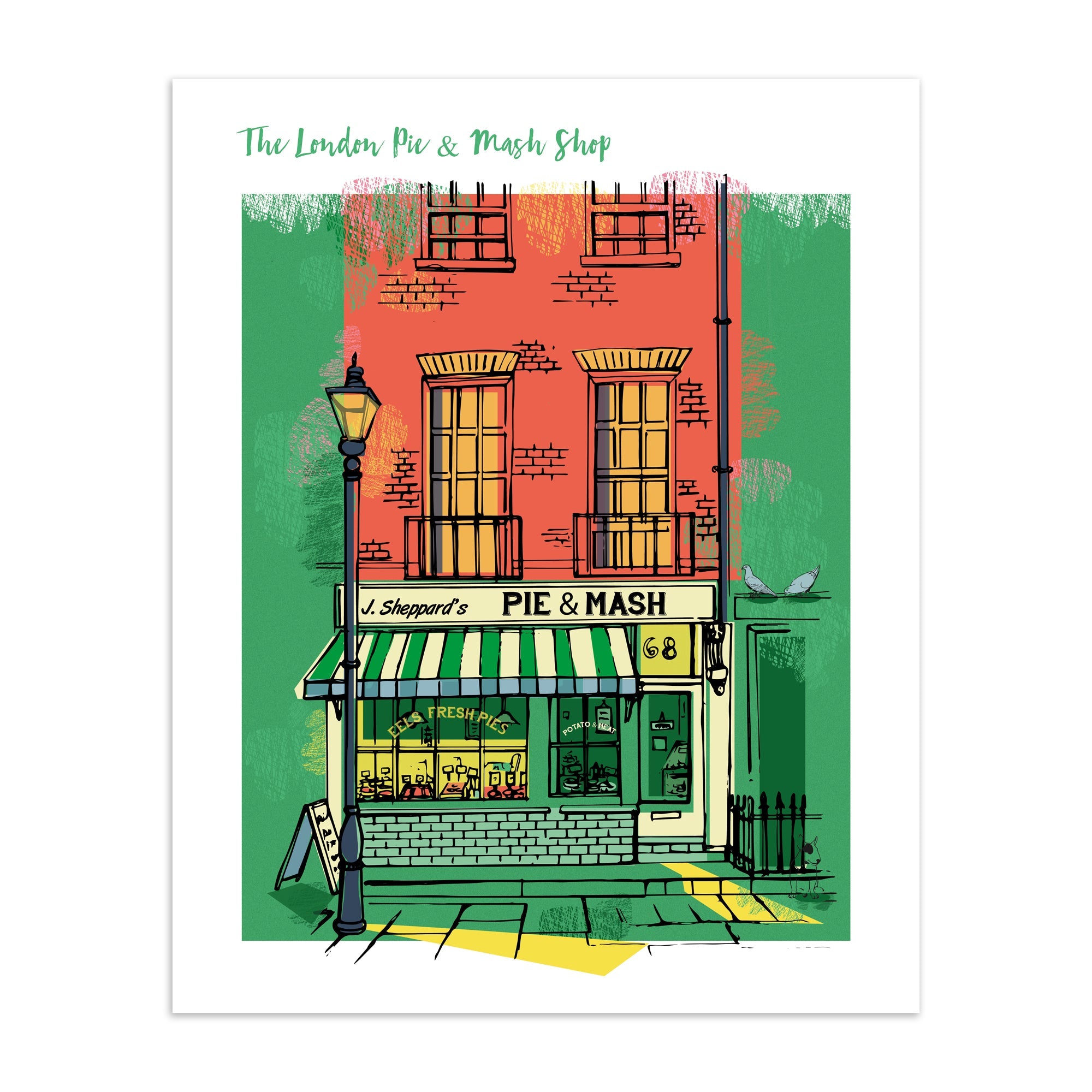 This vibrant travel art print features the London Pie & Mash Shop, amidst a bright orange and green background. 'The London Pie & Mash Shop' is part of our Rocket68 collection, a series of travel art prints focusing on areas around London.