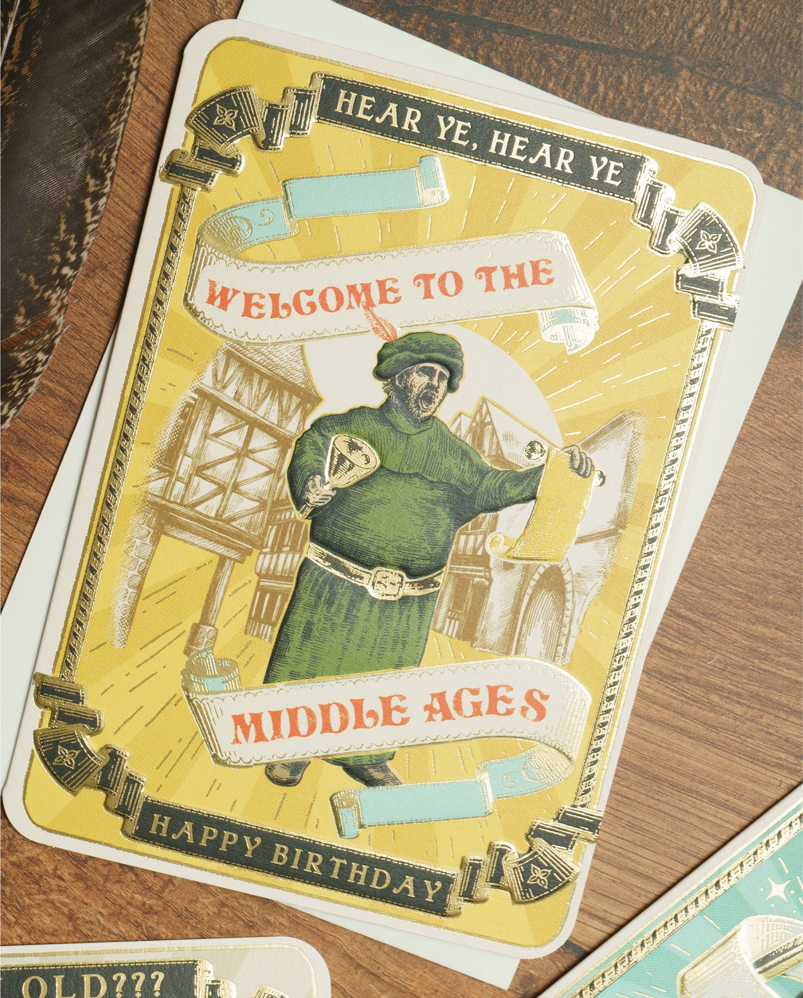 Make them laugh on their birthday with this witty medieval period inspired card. Featuring an intricate illustration of the town crier, this humorous greetings card reads "Hear ye, hear ye, Welcome to the middle ages! Happy Birthday".